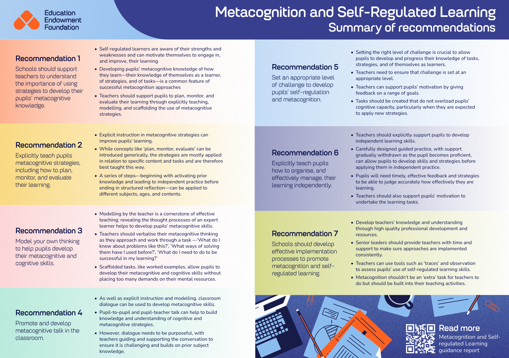 Metacognition is a well known term but perhaps less well understood for some busy teachers. Education Endowment Foundation guidance on the topic of 'Metacognition and Self-regulation' has always proven popular and now it is new and updated so it is well worth returning to explore.